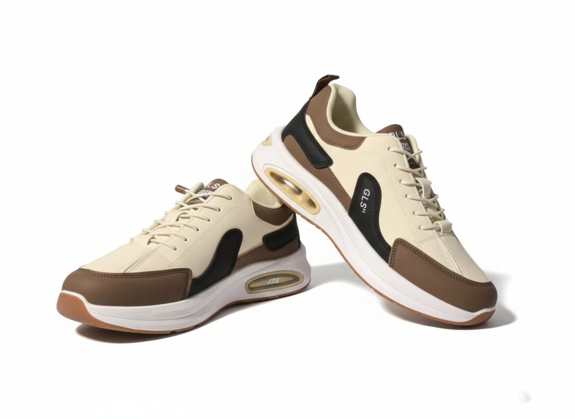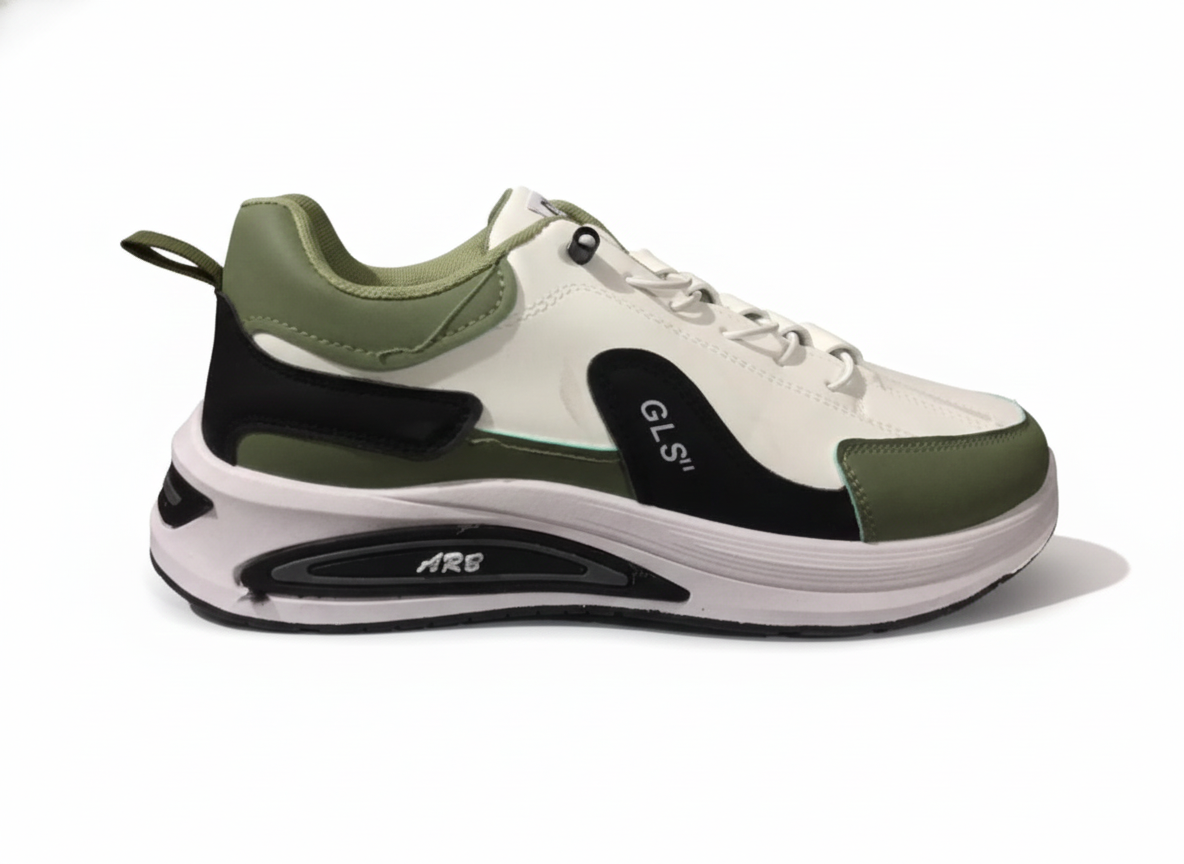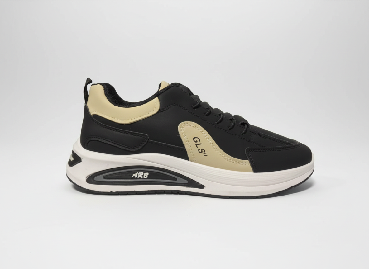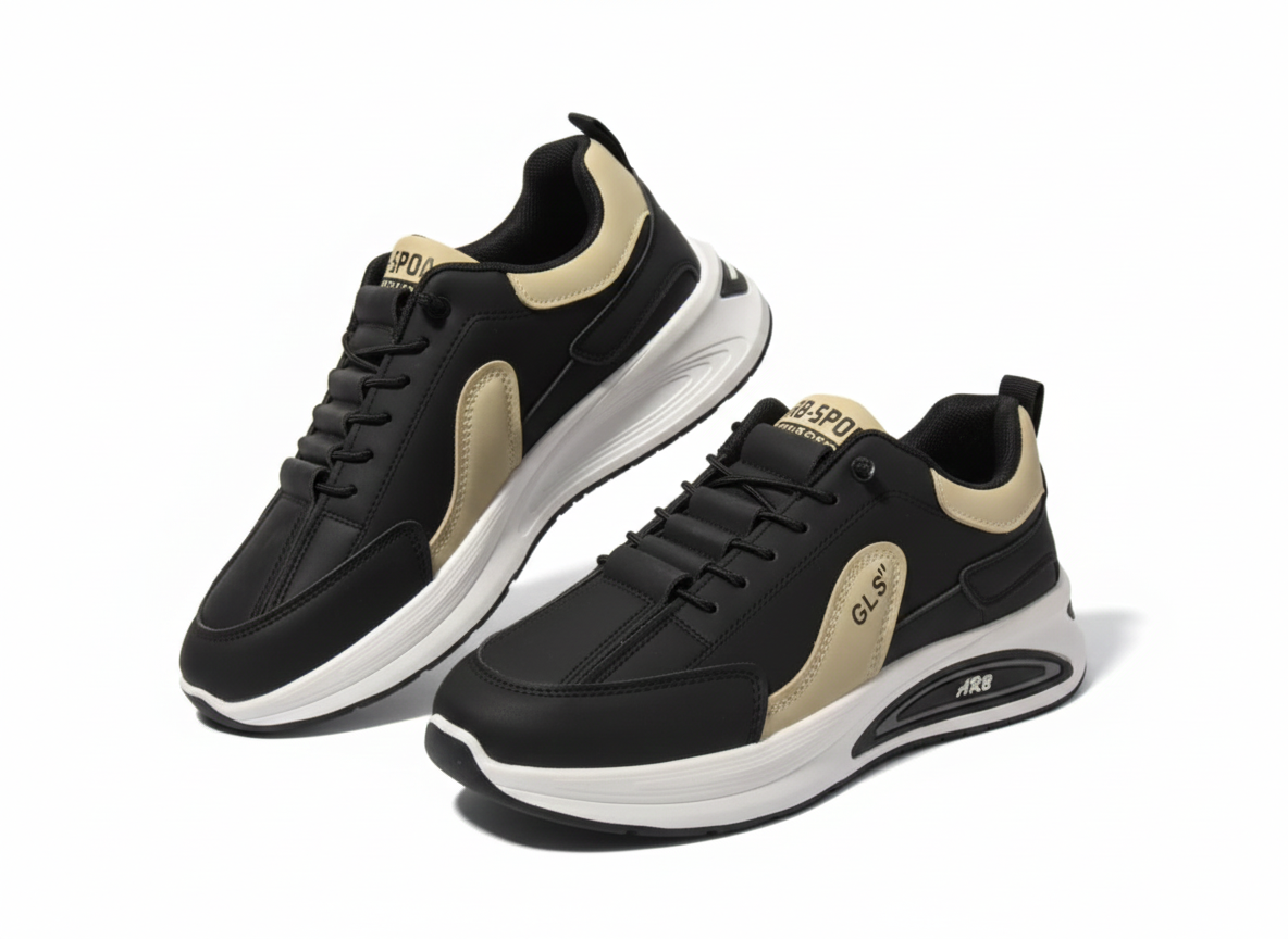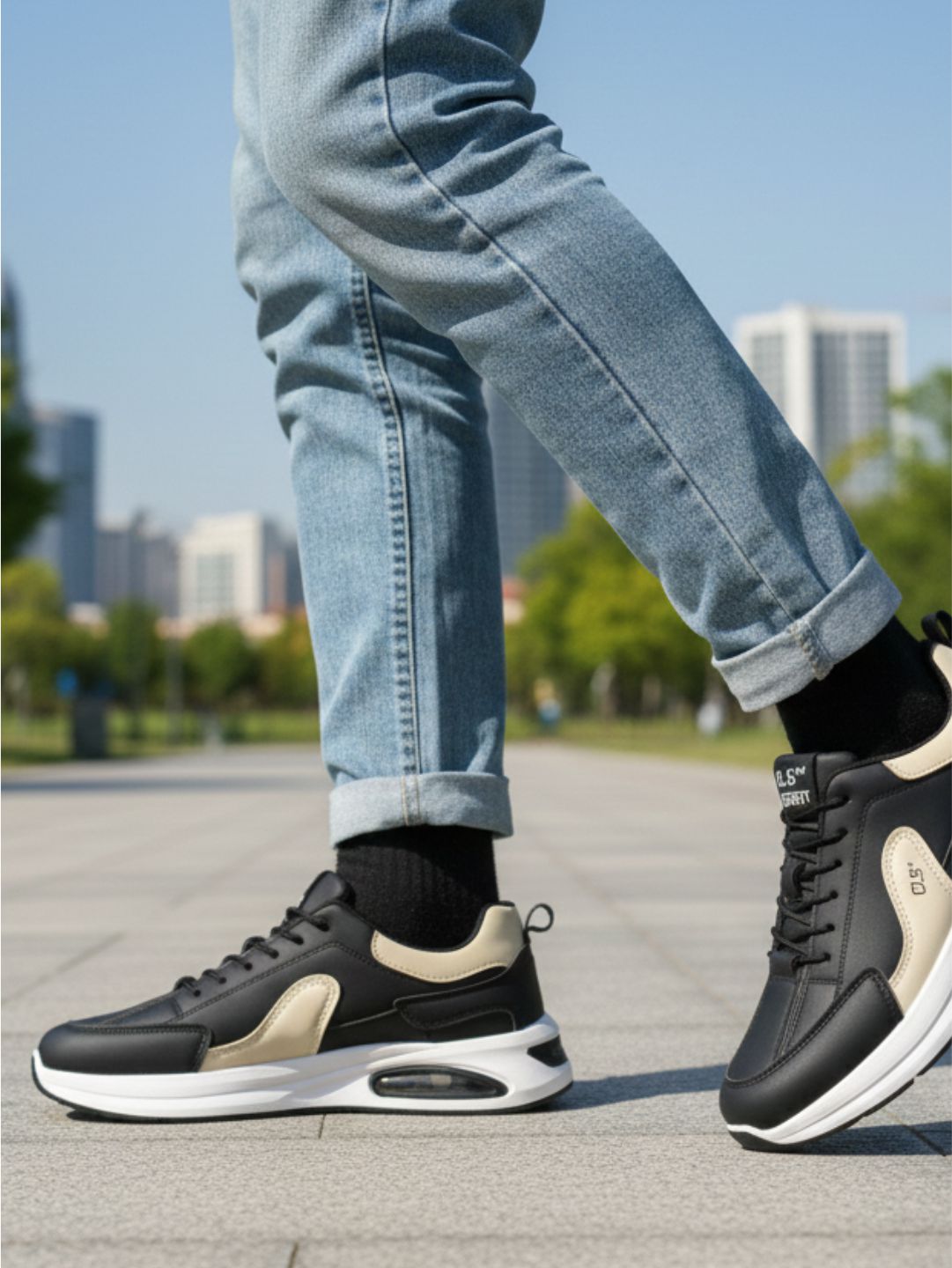 These men’s sports sneakers feature breathable mesh, lightweight cushioning, and a durable anti-slip sole—designed for training, walking, and everyday wear with cream and Gold , black and cream, and black and green looks.